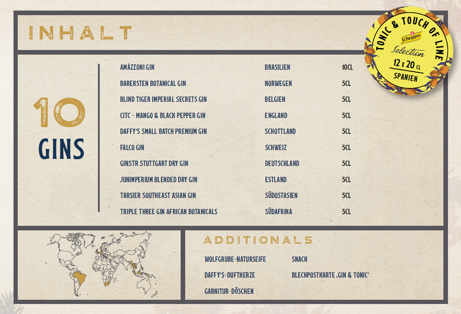 Das Set ist auf das Touch of Lime von Schweppes Selection abgestimmt, wobei natürlich auch andere klassich-zitrische Mixers (wie z.B. das Fever-Tree Indian, Fentimans Indian, 1724 oder Thomas Henry) verwendet werden können. Puristen dürfen die Gins selbstverständlich auch gleich pur geniessen.. 🙂