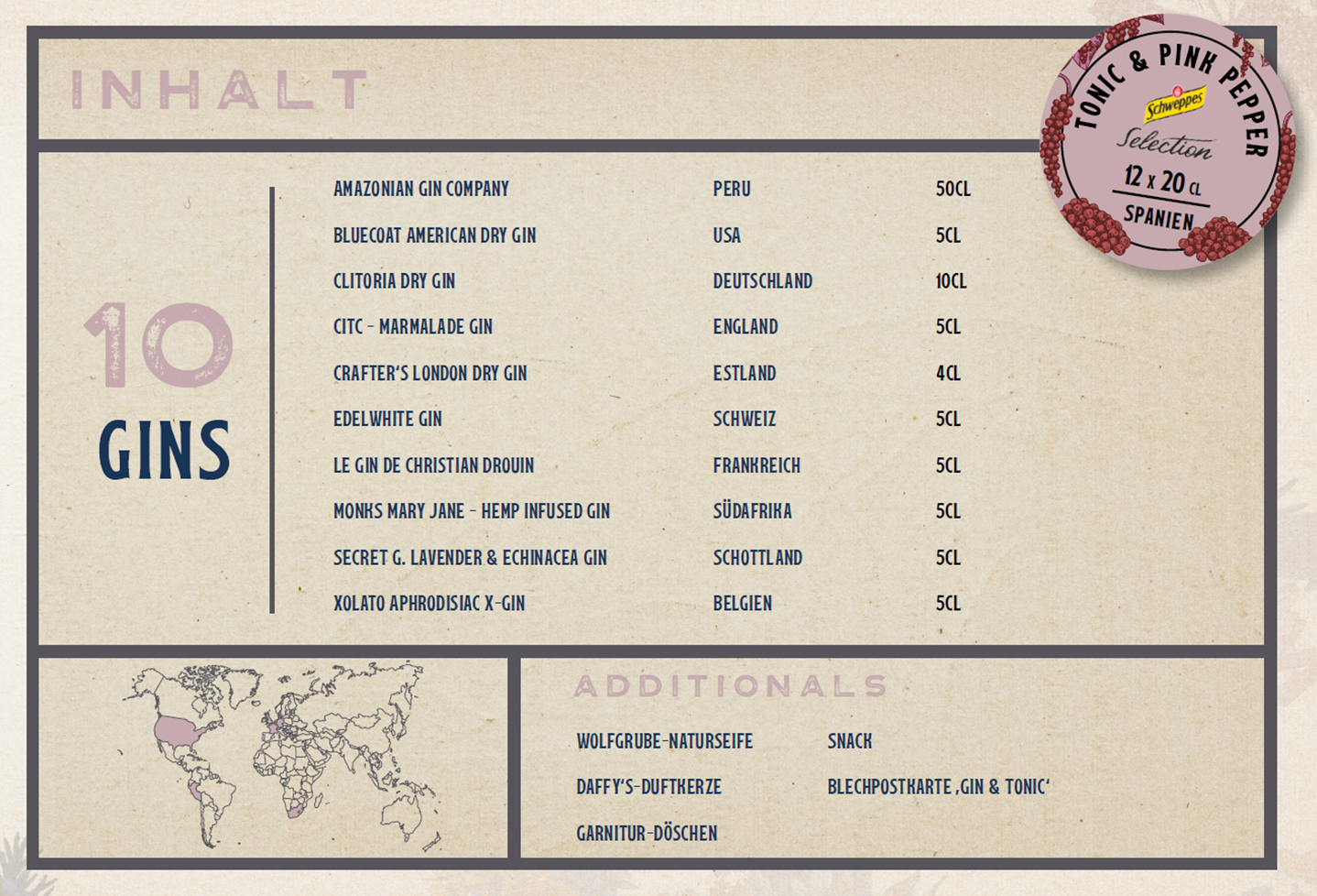 Das Set ist auf das Pink Pepper Tonic von Schweppes Selection abgestimmt, wobei natürlich auch andere würzig-herbale Mixers (wie z.B. das Fever-Tree Mediterranean, Swiss Mountain Spring Rosemary oder Gents) oder dann ein klassisches / zitrisches Tonic verwendet werden können. Puristen dürfen die Gins selbstverständlich auch gleich pur geniessen.. 🙂